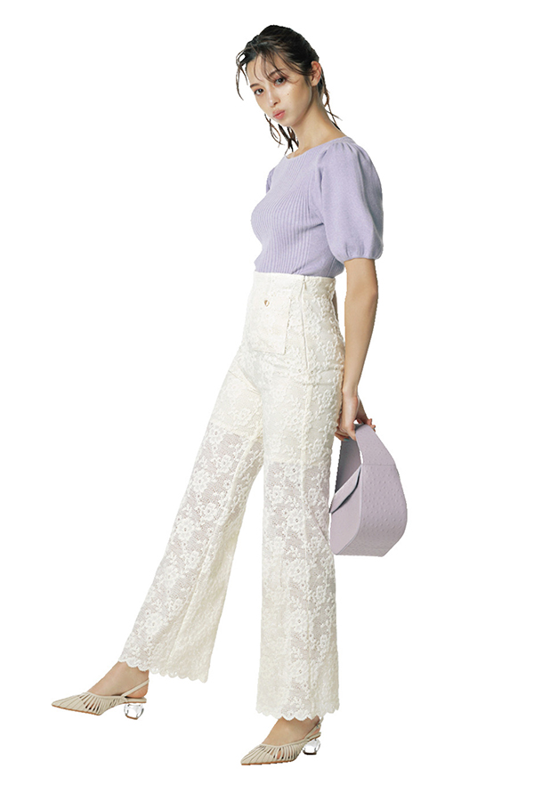 レース地に花柄刺しゅうをONしたデコラティブな白パンツは、甘めのトップス合わせでエモさを盛って。バッグにも優しくて女らしいラベンダーをリンクさせて春っぽさ全開です♡