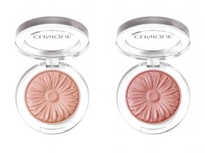 頬の内側から外側にふんわり丸くぼかして求心顔に。淡く薄づきのベビーピンクチークなので、頬広めにのせて顔全体をピンクみがかって見せるのがピュア感を高めるコツ。