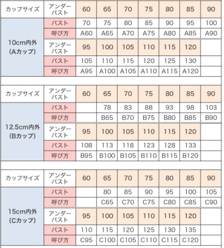 ブラジャーサイズ一覧表
