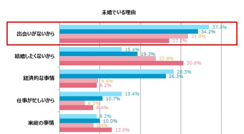 このことから、結婚したくない人が増えていて生涯未婚率が上がっている訳ではなく、結婚はしたかったけど出会いや仕事、経済的な理由で未婚率が上がっていることが分かります。また「出会いがない」が最大の回答であることから、結婚をなんとなく後回しにしてしまった人が多いようです。