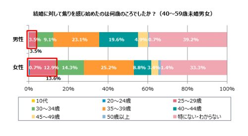 結婚に対して焦りを感じ始めたのは何歳のころでしたか? と40〜59歳の未婚男女に聞いてみると、最も焦った年齢が「35〜39歳」という結果に。結婚したい年齢を過ぎてからやっと焦っている人が多いようです。