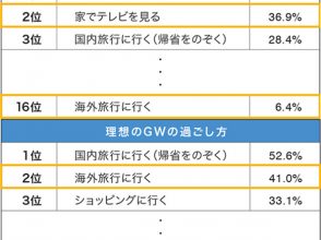 また“理想”と“現実”の差に着目すると、20代と30代が「4.0連休」で同じ、40代は「3.8連休」、50代は「3.0連休」。ゴールデンウィークの連休日数の“理想”と“現実”は、世代が上がるに連れてギャップが小さいことが分かりました。年を取るにつれて、理想に追いつこうとより一層考えるようになるのでしょうか。興味深い結果になりました。