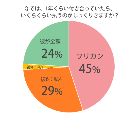 また、最後に「では、まったく恋愛感情のない、完全な男友達だったらどう?」と聞いてみると、平均はグッと落ちて4534円。全体の65%が「ワリカンでいい!」と回答し、「ワリカン~6割くらいでいい」で全体の9割以上を占めました。「逆に払ってもらったほうが面倒なことになる」ということで、友達であればワリカンで全然問題なしですね。