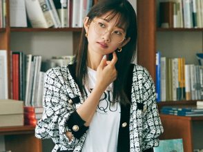 温度調節に便利なカーデは、差し色にもなるブルーを。透け感があるくらい薄手で、ほんのりラメ入りなのがポイント。