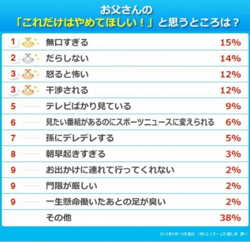 お父さんの「これだけはやめてほしい!」と思うところを伺ったところ、1位「無口すぎる」15%、2位「だらしない」14%、3位「怒ると怖い」12%、同率3位で「干渉される」12%という結果となりました。