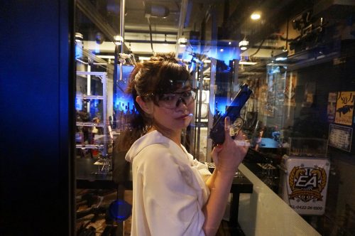 こちらのお店のシューティングレンジは、都内最大級の10メートル。友達同士で行ってもOK、3人までは同時に撃てます。