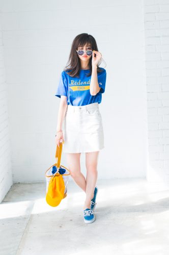 5.ひざ丈デニムスカート×派手スニーカーで、おしゃれ感度の高さをアピール!