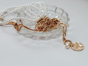 ネックレス[Tスマイルマイクロペンダント/18KYG]¥73,000(ティファニー・アンド・カンパニー・ジャパン・インク)、Tシャツ[web限定]¥7,500(JILLSTUART 青山店)