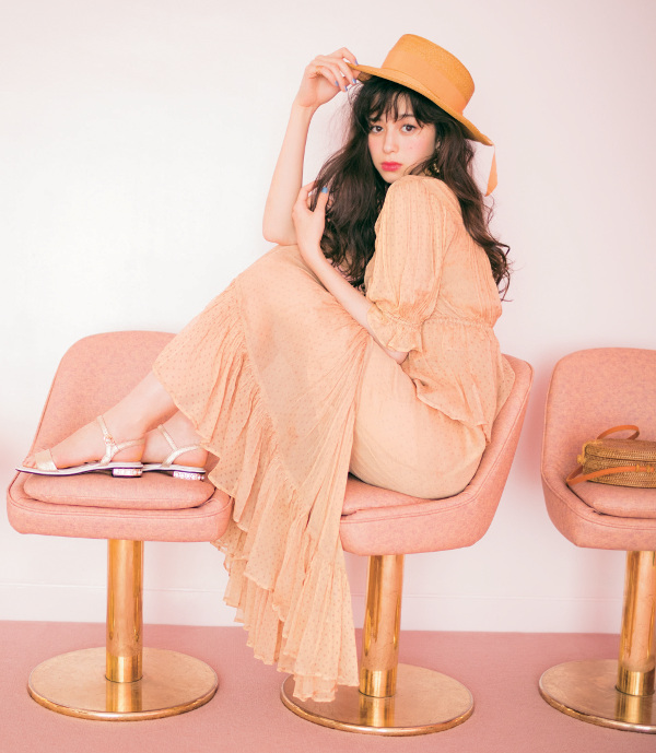 くすみのあるピンクが大人かわいい、ブラウス×スカートの旬顔セットアップ。ヴィンテージ感のあるフリルやシフォン素材が映えるフレンチシックなアイテムです♡小物は、カンカン帽や丸かごを合わせてクラシカルにコーディネート。