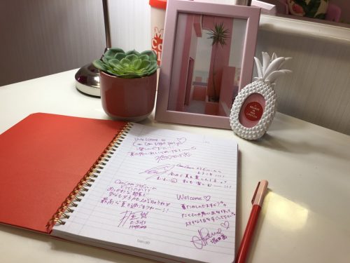 こちらのノートには、オープニングイベントに来てくれた、楓・堀田茜・まい・石川恋の4人のメッセージも! 宿泊した人も、メッセージを残して、みんなの思い出が詰まった一冊にしてくださいね!