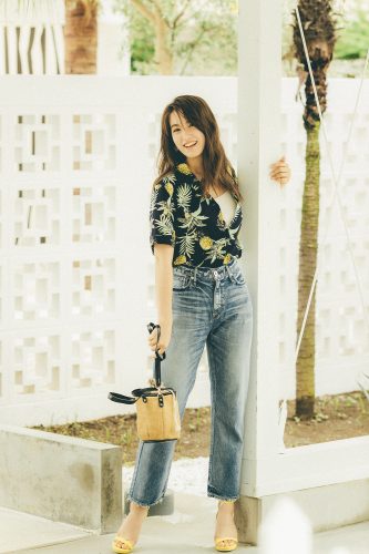 トレンドのパイナップル柄で、ヴィンテージ感のあるデニムを今っぽくコーディネート。シャツはデニムにINすることで、きちんと&女の子らしい印象に♡