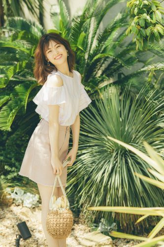 華やかなフリル&大胆なオフショルが印象的な「フォト映え」ブラウスに今年トレンドのパイナップルバッグをプラス。