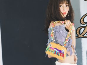 甘めの肌見せトップスにダメージデニムを合わせたギャップコーデは、男子ウケも抜群!ラフなデニムをMIXすることで、甘×甘コーデよりも親近感&好感度がUPするのでお試しを♡ デニムは、夏らしい薄めのブルーを選べば、ラベンダーのトーンもしっくりとなじみます。サングラスをかけたお茶目なニコチャンBAGをアクセントに、テンション高めな夏コーデを楽しんで!