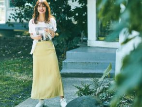 花柄よりもシャレた雰囲気に仕上がる、グリーン多めなボタニカル柄のマキシスカート。マキシ丈の柄スカートに合わせる華奢キャミは、潔く肌見せしてギャップを狙うと好バランス。スカートの柄から1色拾うのがルールです。