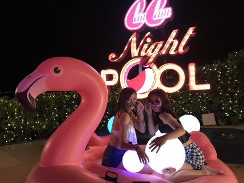 ハートのフロートがたくさん浮いてます♪ 広島のナイトプールは「Heart♡Island」をテーマにしています。