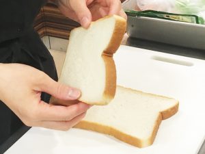 食パンにも向きがあります。四辺の耳をよく見てみると、焼くときに上になっていた一辺は、他の三辺より柔らかく少し凹んでいます。重ねるときにパンの向きを揃えるよう気をつけると、断面を綺麗にカットできます。