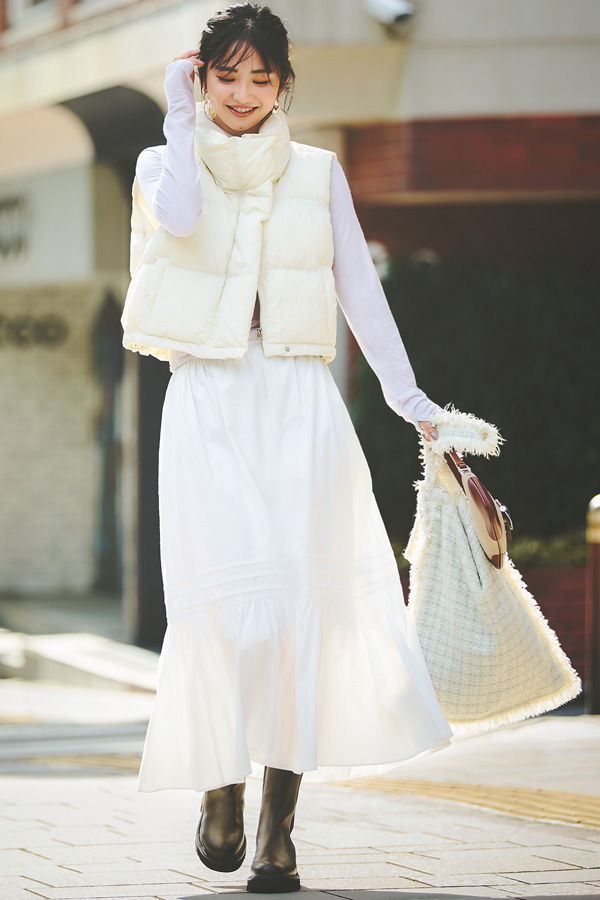 ホワイトワントーンのカジュアルコーデなら、スポーティな白ダウンベストを効かせてもきれいめ。今年っぽい短丈アウターなら、フェミニンなティアードスカートがカジュアル顔に変身します。トートバッグも白でまとめたら、足元はダークカラーを選んで締め色効果を発揮。