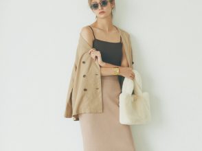 仕上げは、赤のカーディガンで秋らしい差し色をプラス。レディにまとめた大人っぽいコーデには、ボア素材のバッグやソックスブーツなど、トレンド小物を盛り込むのが鮮度UPのポイントです。(スタイリスト・橘内 茜さん)