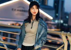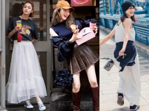 ヴィンテージライクなダメージ加工と台形ミニ丈が茶目っ気満点。厚手の生地なので型くずれせず、歩いてもキレイな形をキープしてくれるのもうれしいポイント。ツートーンコーデに小物をきかせて、さりげなくおしゃれ感度の高さもアピール。