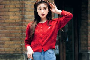 ニット×デニムの鉄板コーデも、甘めな〝ひと盛り〟アクセントがあるアイテム同士なら一気に鮮度UP! こっくり真っ赤なケーブル編みカーデは、胸元のキュートなミニ猫刺しゅうが、さりげないのに今っぽいワンポイントに。パールがあしらわれたフェミニンなデニムを合わせると、上品レトロなカジュアルコーデが完成します。