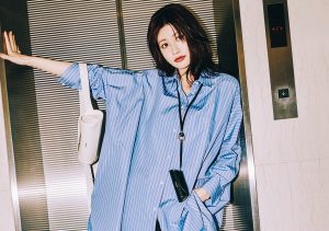 ビッグサイズのシャツに黒パンツを合わせたハンサムコーデ。トップスにはブルーのストライプシャツをチョイスして爽やな印象に。スクエアトウパンプスのハンサムさとメタルアンクレットの放つ色気が、他にはない唯一無二の洒落感バランス。アイコニックな〝カンノーロ〟のリップケースをネックレス代わりに、アクセントを加えて。