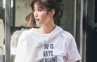 シルバーのロゴが目を引くミニワンピにブルゾンをルーズにはおったスポーティコーデ。ラインソックスとスニーカーで作るどこか懐かしい足元も感度を高めるポイント。肌見せや差し色の赤バッグで、モノトーンコーデにメリハリを効かせて。