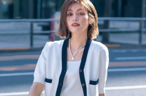 デコルテの透けと落ちそうでハラハラするシアーシャツで、色っぽさたっぷり。ハンサムな白のセミワイドパンツは、肌見せを爽やかに中和してくれるバランサー的役割も。ベージュのパンプスやパールなどフェミニンなアイテムを散りばめて、きれいめな印象にまとめて。