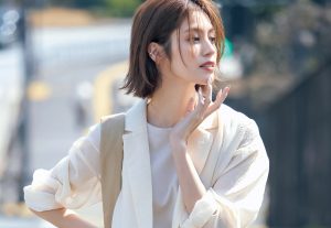 ベージュのワントーンコーデは、ヴィンテージっぽいべっ甲調ボタンをアクセントにしたシアージャケットと、ゆるっとしたパンツ&スニーカーで、肩ひじ張らないハンサムスタイルが完成。華奢なアクセや白〜淡ベージュでまとめることできれいめな印象がつくれます。