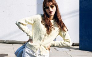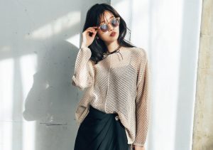 顔周りが華やぐ太めボーダーニットは程レトロなクロシェがトレンド。すっきり見える黒のスリットスカートを合わせたら、ワンポイントで即“今っぽ”が叶うキュートなスニーカーをプラス。足元がボリューミーな分、コーデはシンプルがバランスよし。お茶目なサングラスもサマになります。