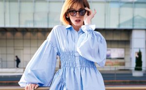 オトナきれいなシャツワンピに、裾のビッグフリルやコンシャスな袖、シャーリングをきかせたウエストで旬のエッセンスをプラス。仕上げはきれいめな黒小物を全体に散らして大人っぽくまとめて。