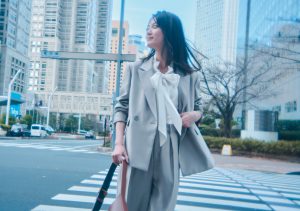 襟元のフリルと大きめのボウタイが、凜としたジャケットスタイルを華やかにブラッシュアップしてくれる。さりげないボリュームスリーブで、ジャケットを脱いでもサマになるのもいいところ。まろやかなベージュセットアップを合わせて、親しみやすさと〝しごでき〟感を両立!