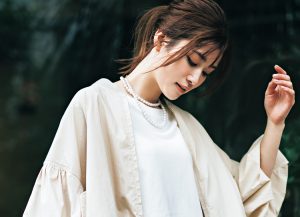 一点投入でセンシュアルな魅力をプラスする、シルキーなサテンシャツ。大胆に開いたスキッパーカラーやベージュのニットワンピを覗かせるように合わせると、ハッとするほど美人なワントーンコーデが完成します。仕上げにパールチョーカーでモードな味付けをすれば、媚びない女っぽさが手に入る。