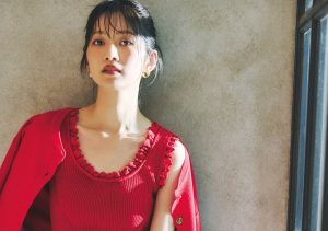 フリルで盛れるニットタンクは、短丈&ボディラインにフィットするシルエット。同色カーデを合わせたアンサンブル風の着こなしも、コンサバに見えすぎず洒落たムードに。ベルトのゴールドバックルをきかせれば、メリハリと同時に華やかさもUP。