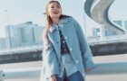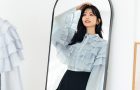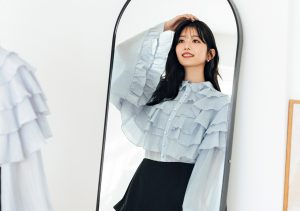 袖がフワッと広がるシアーブラウスが、スタイリッシュなブラックのミニスカによく映える! 清涼感あるドリーミーなアイスブルーと黒の組み合わせが意外にもマッチ。チラリと覗かせた肌や軽やかなブラウスが重くなりがちなロングブーツスタイルに抜け感を生みだします。