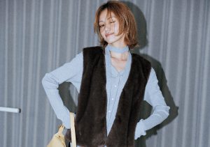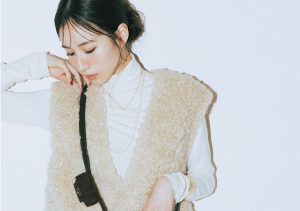 ファーベストが主役のレイヤードにキレのいいレザー風スカートのツヤ感で、感度高めの着こなしに。存在感のある素材同士も、淡色のワントーンでニュアンシーにまとめることで上品に仕上がります。斜めがけしたバッグで、引き締め効果を発揮。