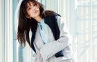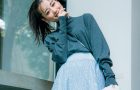 ぽこぽことしたエンボスがスカートに厚みを持たせ、フレアの形状をきれいにキープ。軽やかな素材のアイシーブルースカートを、マットなグレーのハイネックで引き締めるのがリッチなムードの秘訣。仕上げにジャケットの白をきかせれば、肩の力の抜けた色っぽコーデのできあがり!