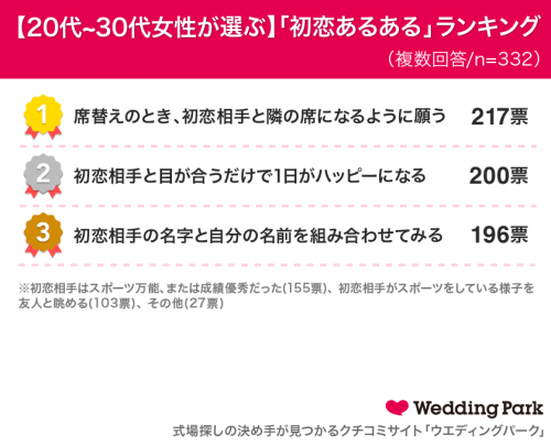 「席替えのとき、初恋相手と隣の席になるように願う」という回答が最も多く、多くの女性が共感する「初恋あるある」として選ばれました。「初恋相手と目が合うだけで1日がハッピーになる」という回答も200票を集め、多くの女性から共感を得ています。この他に、「相手に好きな人がいるのか、友達に聞いてもらう」、「消しゴムに好きな人の名前を書く」、「友達と好きな人が被る」という声もありました。ピュアな恋愛にキュンキュンさせられっぱなしですね♡