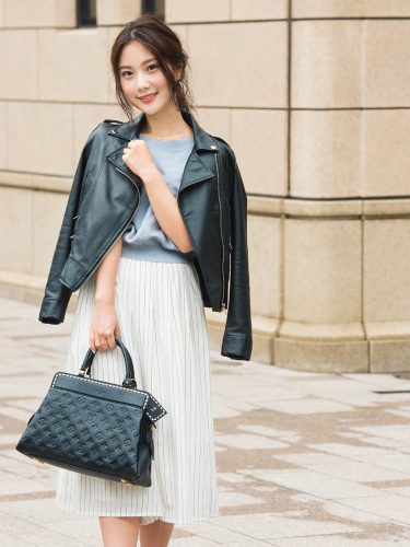 大人かわいいテイストのファッションが好きという野村さん。パステルブルーのニット×ホワイトのガウチョパンツに、レザージャケットとバッグのブラックが締め色になって、ほんのりクールな印象に♪