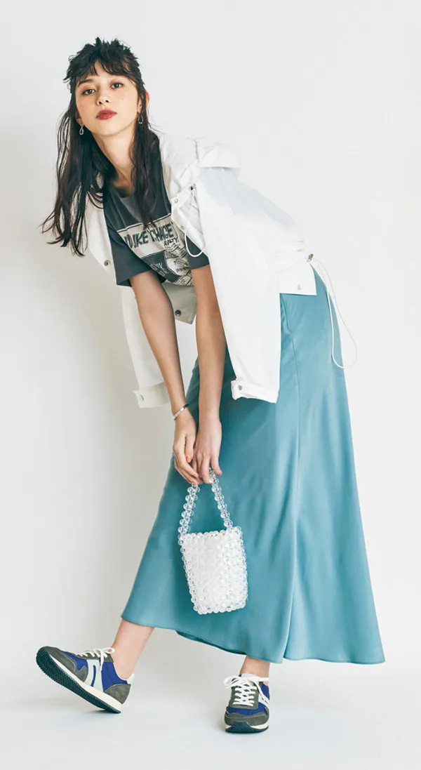 エレガントで女っぽいラベンダースカートには、ブルゾンやスニーカーでスポーティな要素をMIX。ギャップのある組み合わせが今どきのこなれ感に直結。全体に薄めのくすみトーンでまとめると洒落感が高まります。