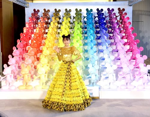 この日お披露目されたのは、90色・90体にもおよぶミッキーマウス立像。ずらりと並んだ美しいグラデ・ミッキーマウスは圧巻! どのカラーのミッキーがお気に入りか問われると、「黄色がお気に入りです。ちょっとレトロな黄色がかわいいですね」とコメント。高橋さんが身にまとっているドレスのようにキュートなイエローミッキーマウスがお気に入り!