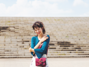 カーディガン¥4,500(シティーヒル<アメリエル マジェスティックレゴン)、Tシャツ¥4,800(ビームス ウィメン 渋谷<グッドスピード>)、共布ベルト付きスカート¥6,900(dazzlin)、バッグ¥12,000(アンビリオン<ペルケ>)