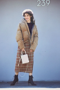 全身ブラウンコーデの足元はヌーディベージュで抜け感を。ブラウンのニットにチェックミニを合わせて、BIGシルエットのコートをプラス! 小ぶりのバッグを斜めに掛けるとスタイルアップ効果もUPします。トーンが異なるブラウンのグラデーションが優しい印象に着地するのも、肌なじみのいい最旬ブーツのおかげ。