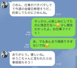 普通ドタキャンされたら「まじか」と思うところを、快く了解しながら「少し顔見たかった」「楽しみにしてたけど、残念」と、自分の気持ちもうまく文章に取り入れているところがキュンポイントですよね!