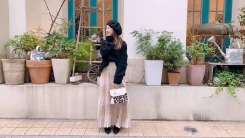 黒のもこもこトップスは、背面にリボンが付いているところがお気に入り。歩くたびに揺れるスカートのシルエットにもご注目を! 全体的にシンプルなので、華やかなレオパード柄バッグでハズしを効かせて、雰囲気おしゃれに仕上げました(大重璃乃さん)