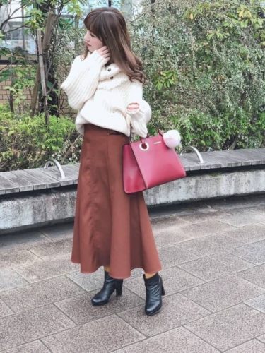 気付けば冬は、ニットばかり着ています(笑)。落ち着きのある色が好きだけど、たまには華やかなカラーが着たくなることも。ミニショルダーバッグは、実用的な上に着こなしのポイントにもなって◎。合わせやすい色なので、ヘビロテしちゃってます(中村早希)