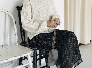ニット¥29,000(HAUNT代官山/ゲストリスト<HAUNT>)、パンツ¥25,000(GREED International Tokyo Store<BED&BREAKFAST>)、バッグ¥5,900(アンビリオン<カシュカシュ>)、靴¥23,000(モード・エ・ジャコモ<メダ>)、首に巻いたスカーフ¥2,296(3rd Spring)、イヤリング¥12,000(アビステ)、タイツ/スタイリスト私物