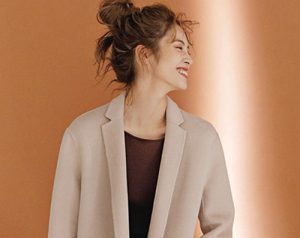 よりフェミニンに着こなすなら、ベージュやピスタチオカラーのタートルニットをすっきりと合わせてもいいですね(スタイリスト・たなべさおり)