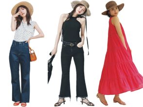 定番のデニムスタイルも、×グリーンニットならフレッシュにアップデート! スクエアな白バッグに黒のギャザーパンプスというキレのいいモノトーン小物でカッコよく仕上げましょう。