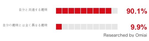 恋人を選ぶ際に「相手の趣味を重視する」と答えたのは、男女ともに7割以上。「とても重視する」「まあまあ重視する」と回答した方の 9割以上が、自分と共通する趣味を持っていてほしいと回答する結果になりました。
