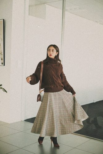 「かわいい」「色合わせがいい」「レトロ感が好き」という声が多数! ざっくりした編み地がかわいいケーブルニットとクラシカルなチェックスカートで、グッドガールな装いに。ざっくりニット×ボリュームスカートの組み合わせは、この冬の鉄板コンビ。また、スカートのチェックにもブラウンが使われているので、リンク感が出て全体がシックにまとまります。服だけでなく、小物も優しげブラウンでまとめて好感度よく!